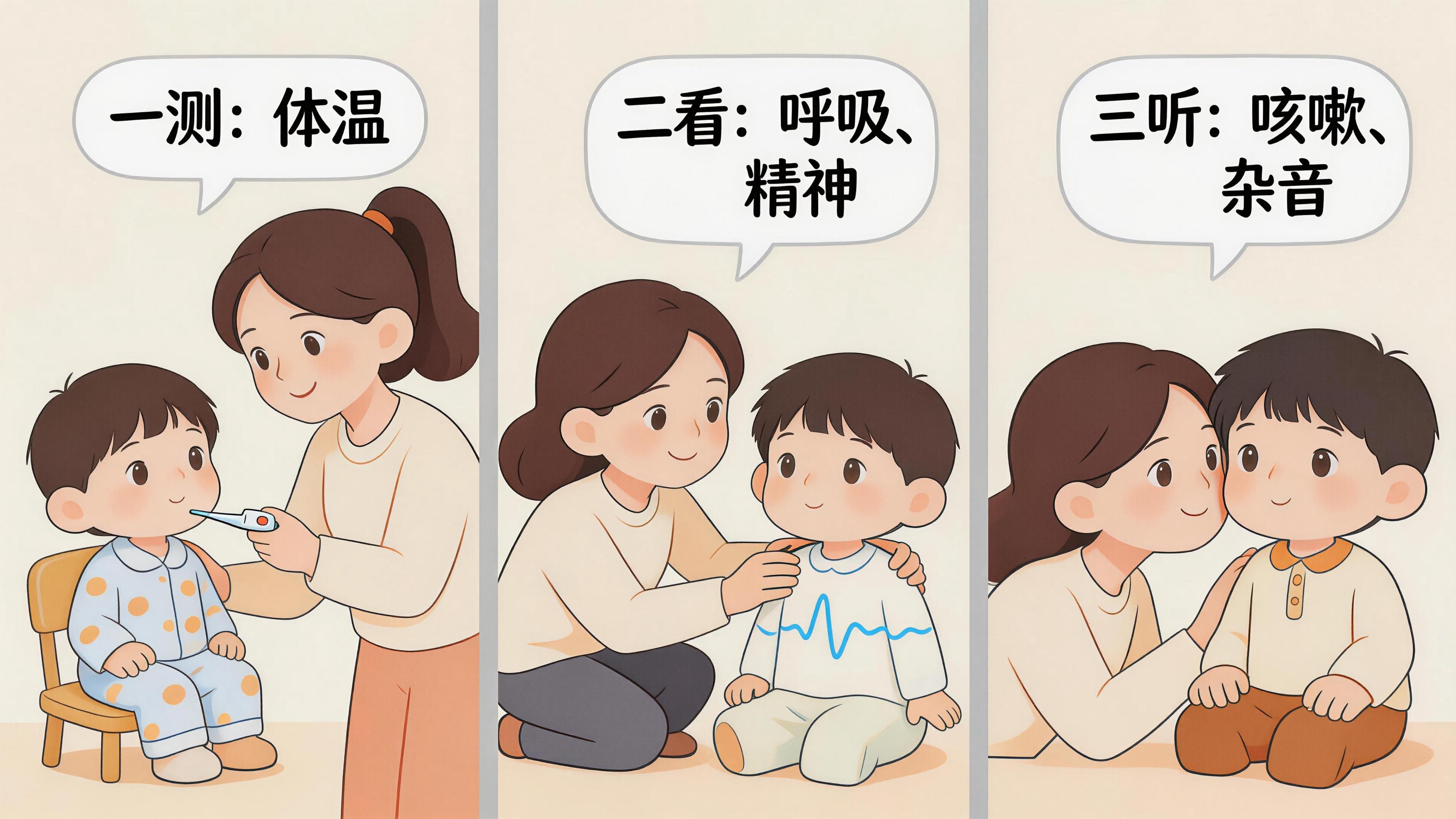 掌握“一測二看三聽”這個方法很實用:測體溫看是否持續高熱;觀察呼吸、精神、飲食和睡眠狀態;仔細聽咳嗽和呼吸的聲音。肺炎的咳嗽聲通常比較深,像是從胸腔裏發出來的,呼吸時還可能帶有“呼哧呼哧”的雜音。