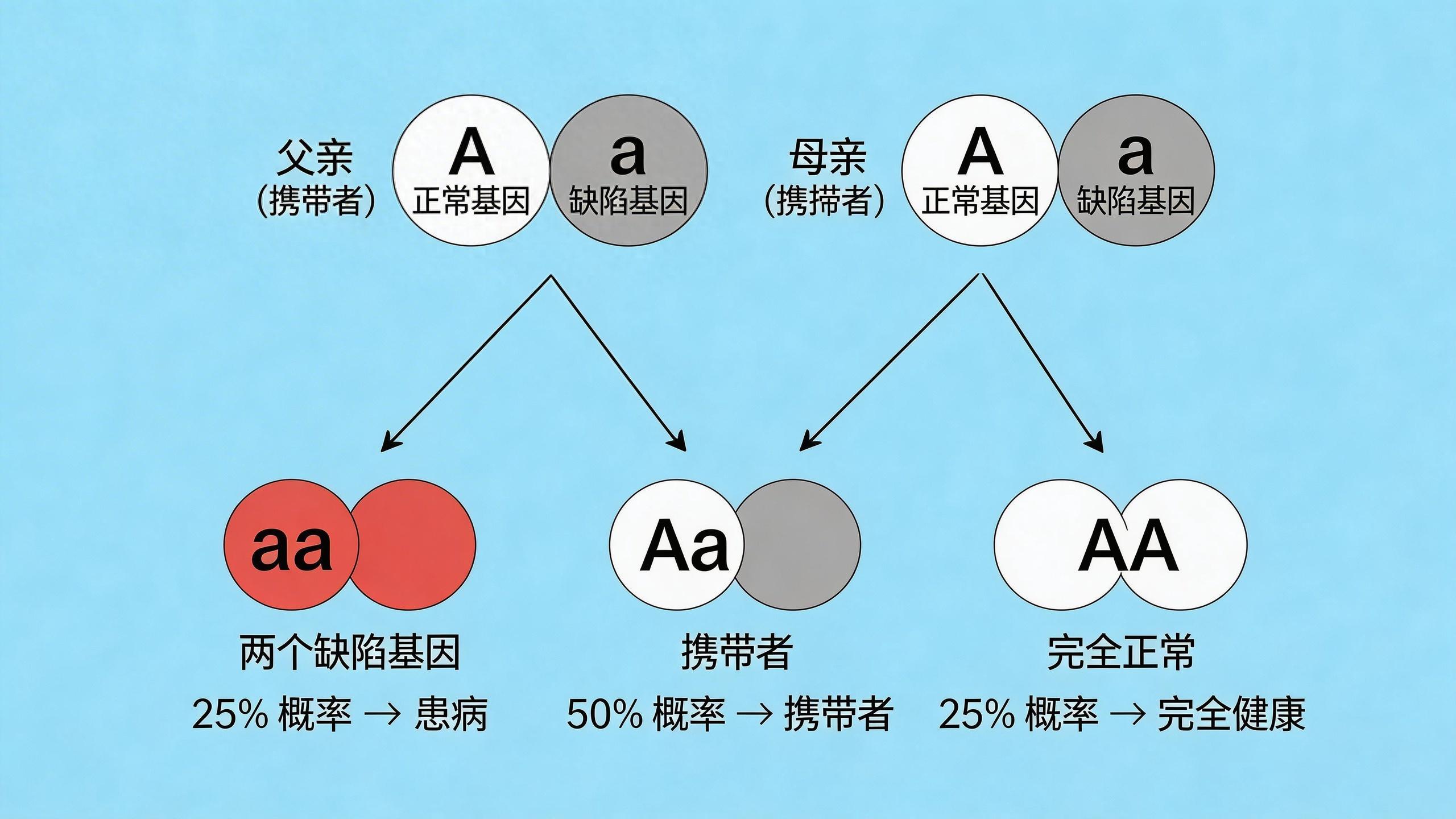 我們每個人就像一本遺傳密碼書,健康與否,取決於書裏關鍵段落是否出了錯。一個重要的事實是,幾乎每個人都攜帶着幾個隱性的缺陷基因,自己不會發病。但當一對夫妻,恰好攜帶了同一個缺陷基因時——就像兩本隱藏着同一處印刷錯誤的書結合了——他們的孩子就有四分之一的機會成爲那個錯誤的顯現者。例如,在南方一些地區,地中海貧血基因的攜帶率相當高,如果夫妻雙方都是攜帶者,孩子就可能患上需要長期輸血的重型地貧。另一種情況是X染色體連鎖遺傳,比如血友病,如果母親是攜帶者,那麼她的兒子就有50%的幾率發病。