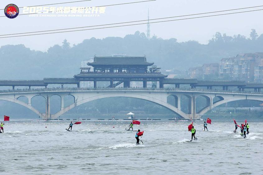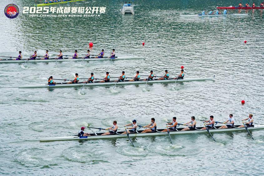 上午10時,隨着發令槍響,2025年成都賽艇公開賽正式進入競技時間,加油聲、吶喊聲響徹南河兩岸。
