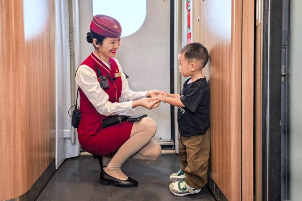 峯會期間,她接待了一對來天津旅遊的“鐵路迷”老年夫婦。老人說,他們平時生活節儉,卻特意攢錢坐復興號商務艙,就是想親身感受中國高鐵的發展。王亞健不僅耐心解答老人關於天津地鐵、景點路線的疑問,還結合自己的經歷,給老人講了京津城際從2008年開通到如今“公交化運營”的變遷。“沒想到坐高鐵還能聽到這麼生動的故事,中國鐵路真是越來越好了!”老人的讚歎,成了對她最好的認可。
