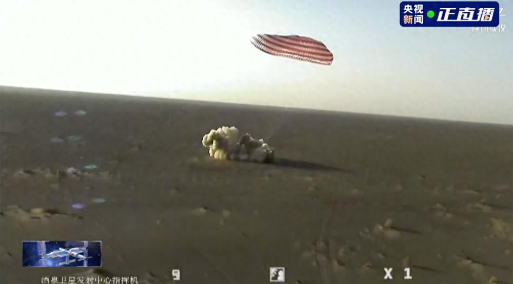 神舟二十一號載人飛船返回艙在東風着陸場成功着陸瞬間。