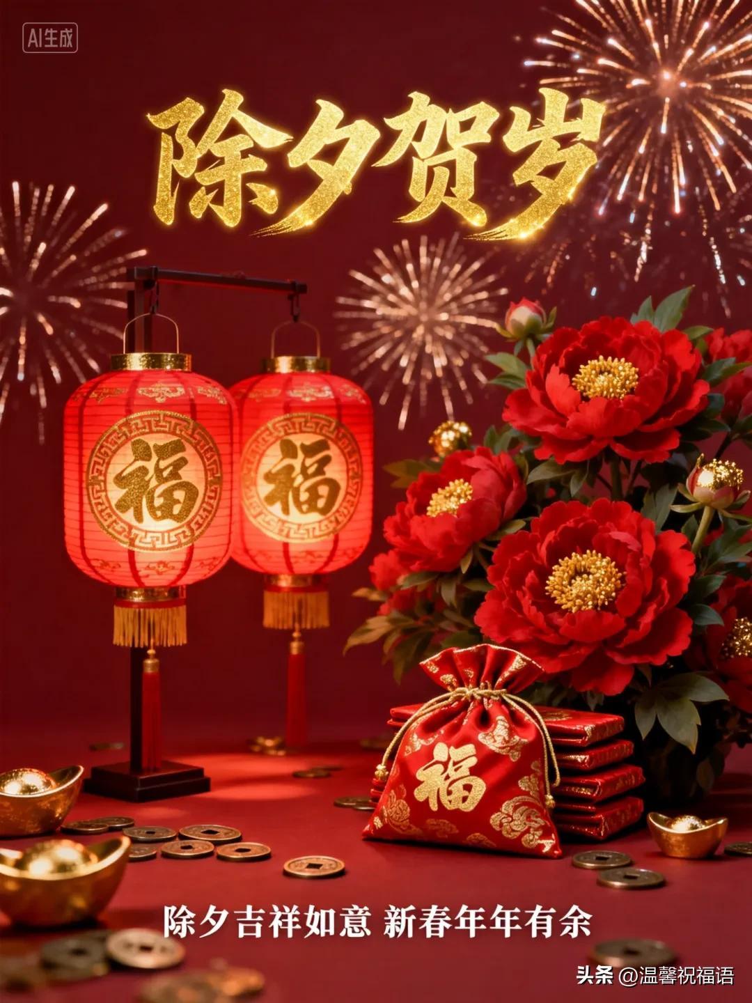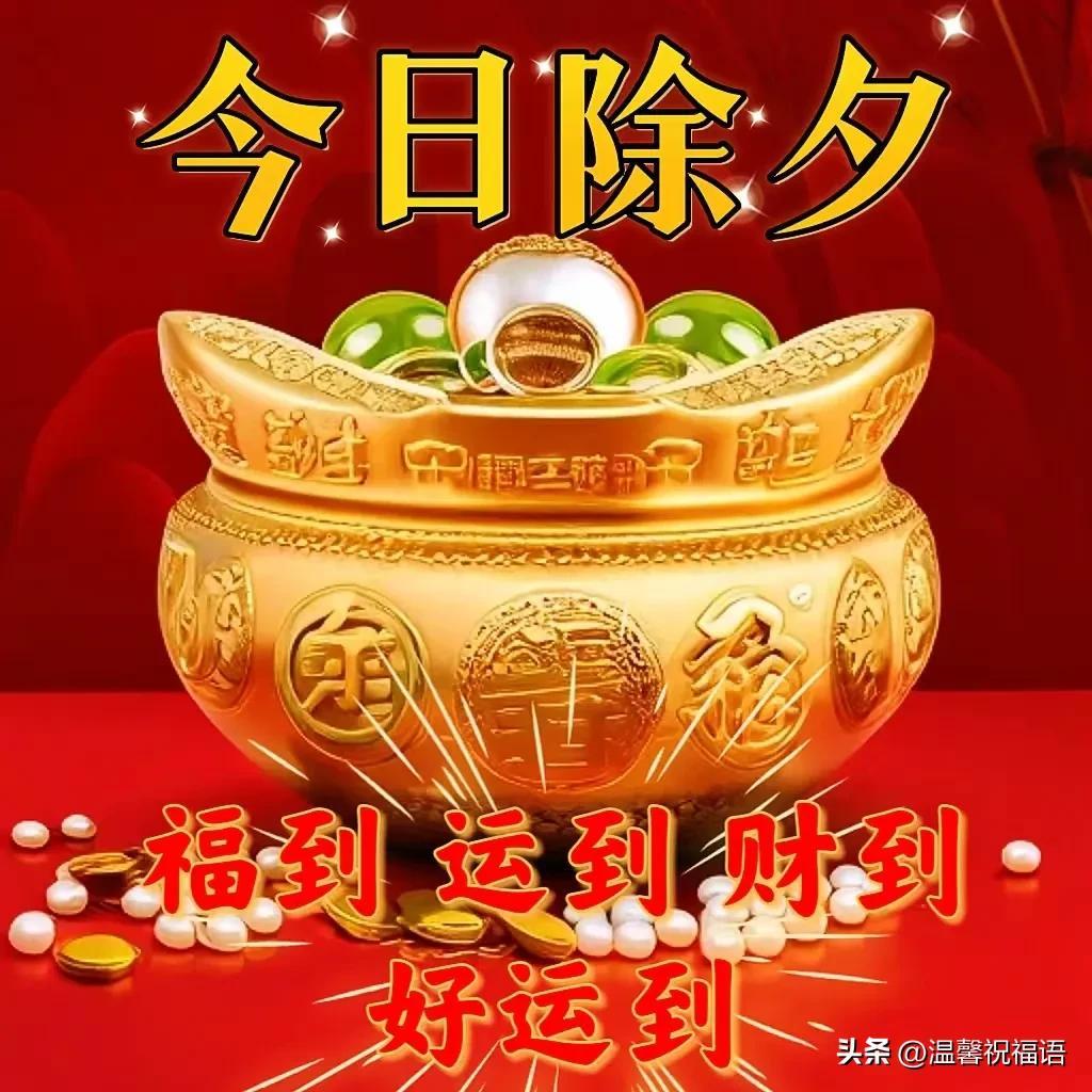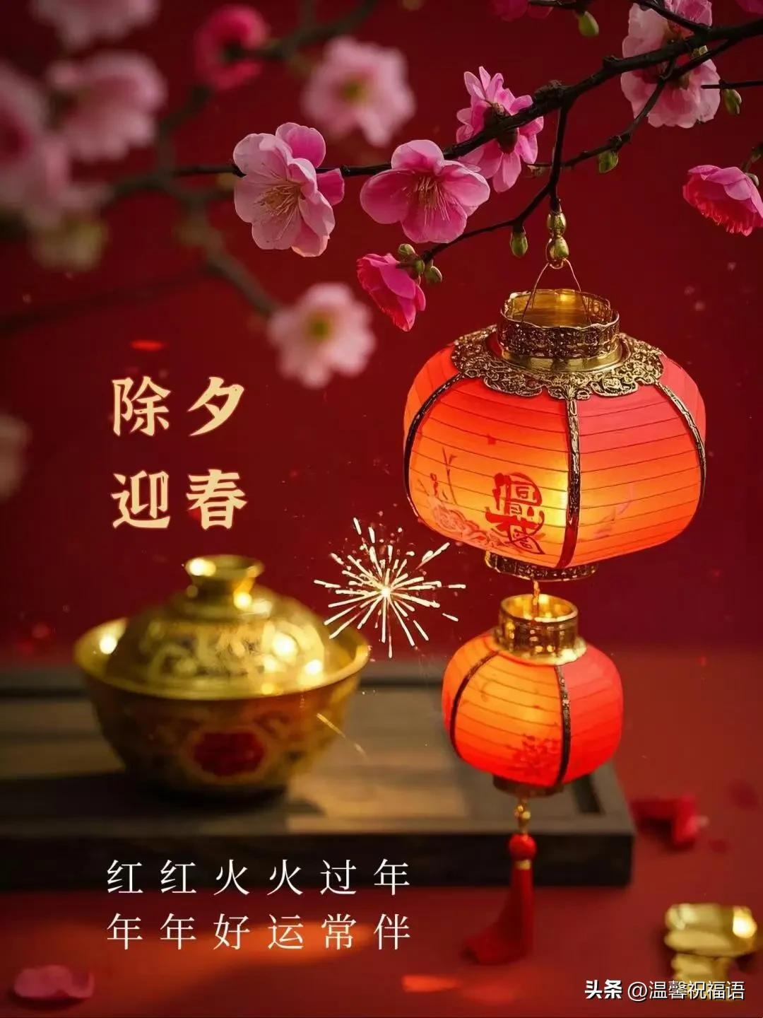 2、除夕臨,福運臨,平安喜樂啓新程。幸福吉祥年年來,大事小事事事順利,大財小財處處發財,親情友情情情如意,官運財運運運亨通,親人愛人人人安康 。