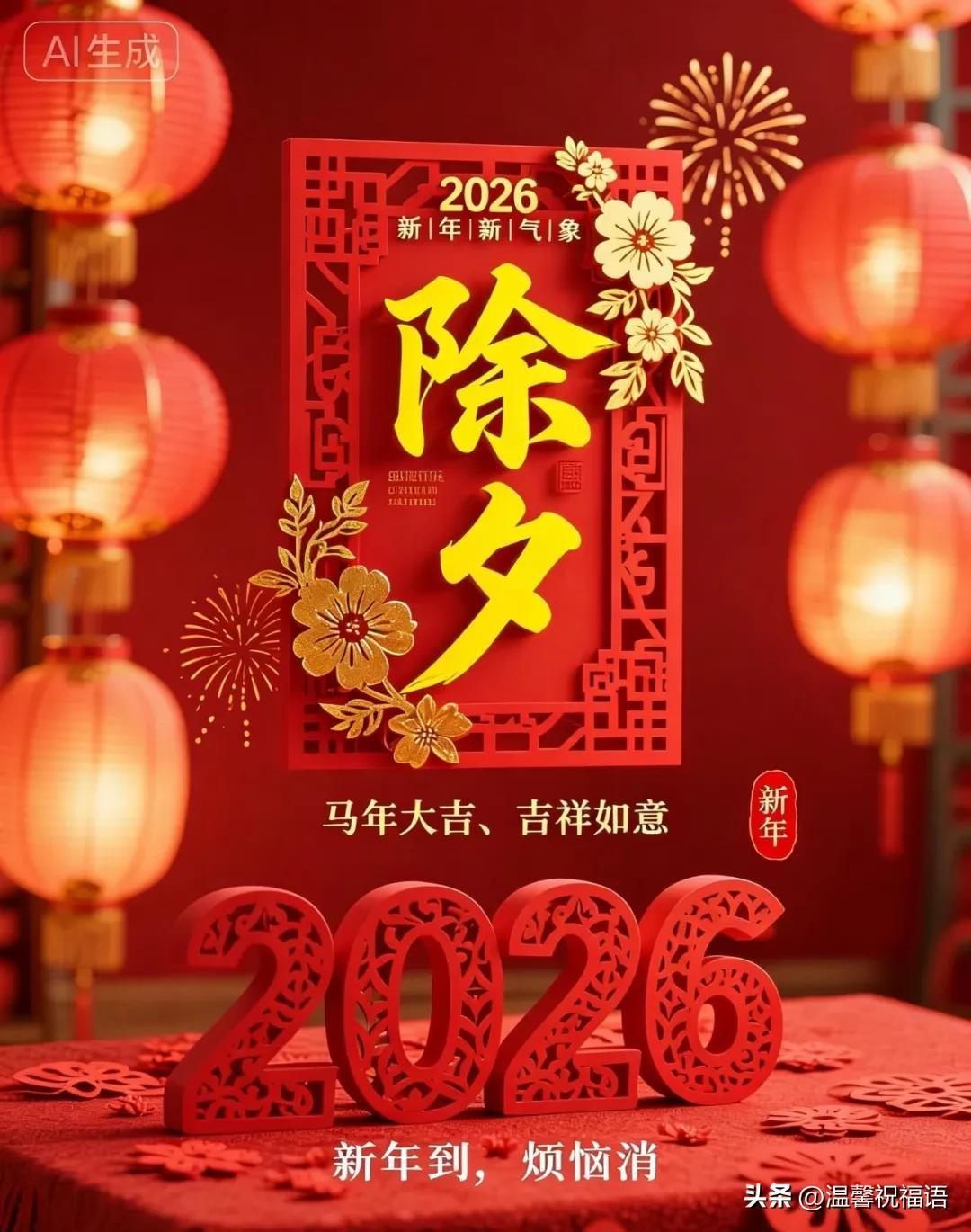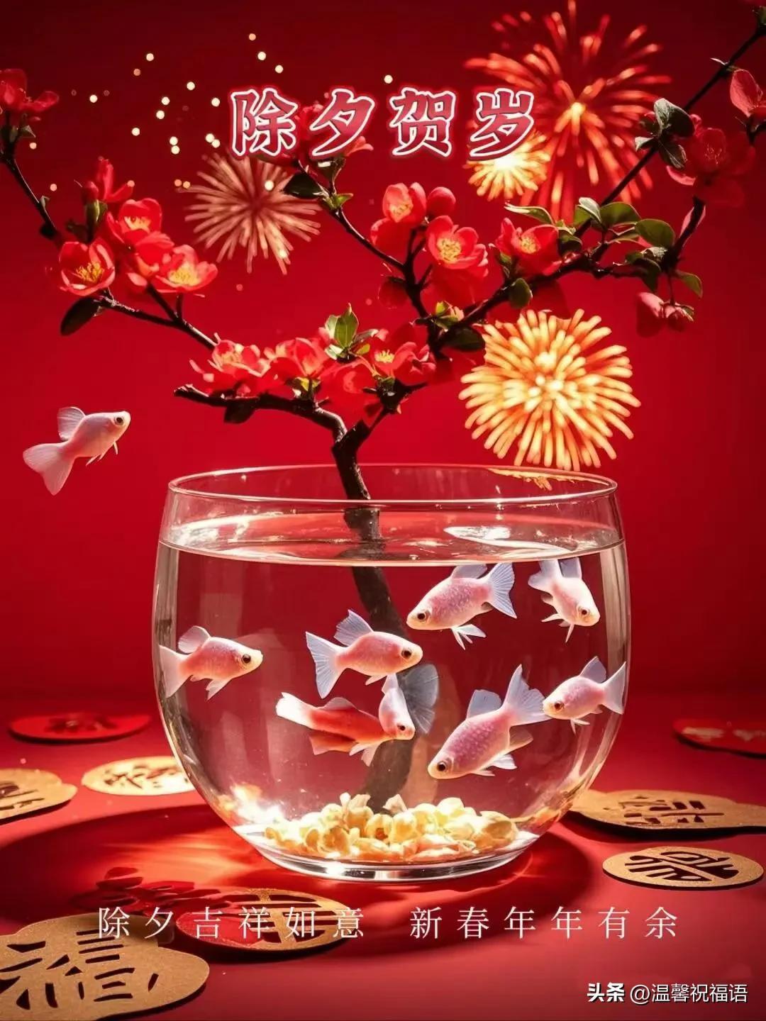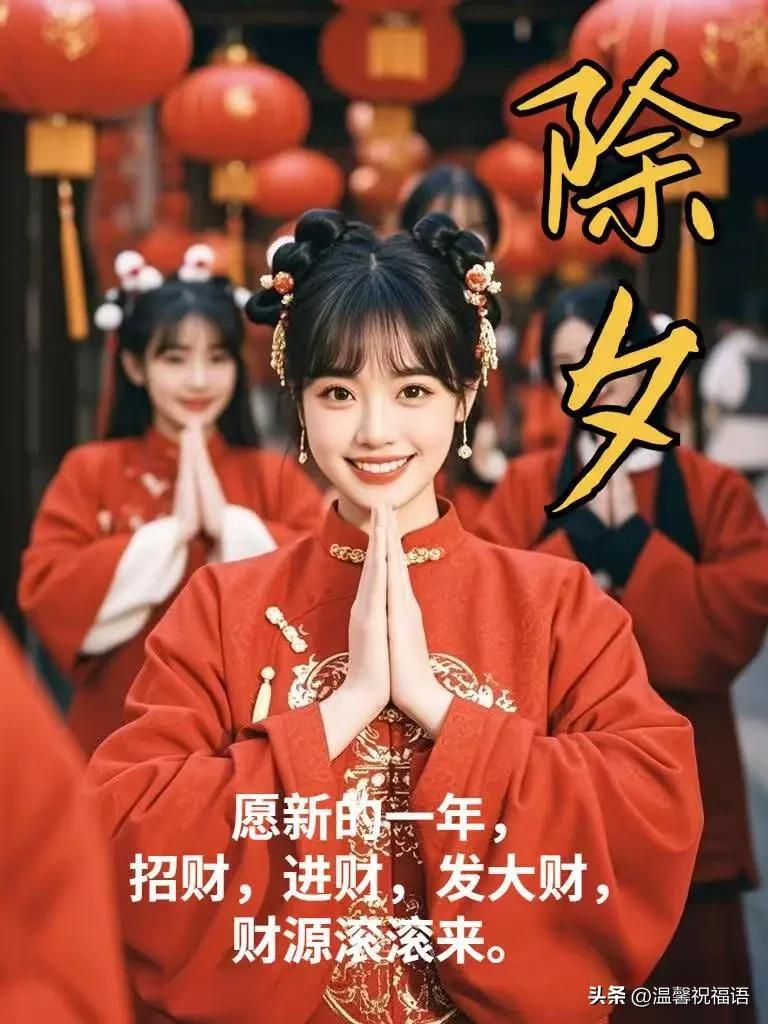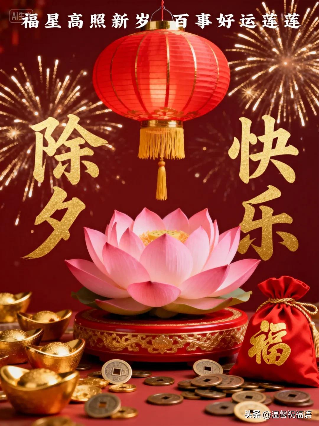 2、除夕臨,福運臨,平安喜樂啓新程。幸福吉祥年年來,大事小事事事順利,大財小財處處發財,親情友情情情如意,官運財運運運亨通,親人愛人人人安康 。