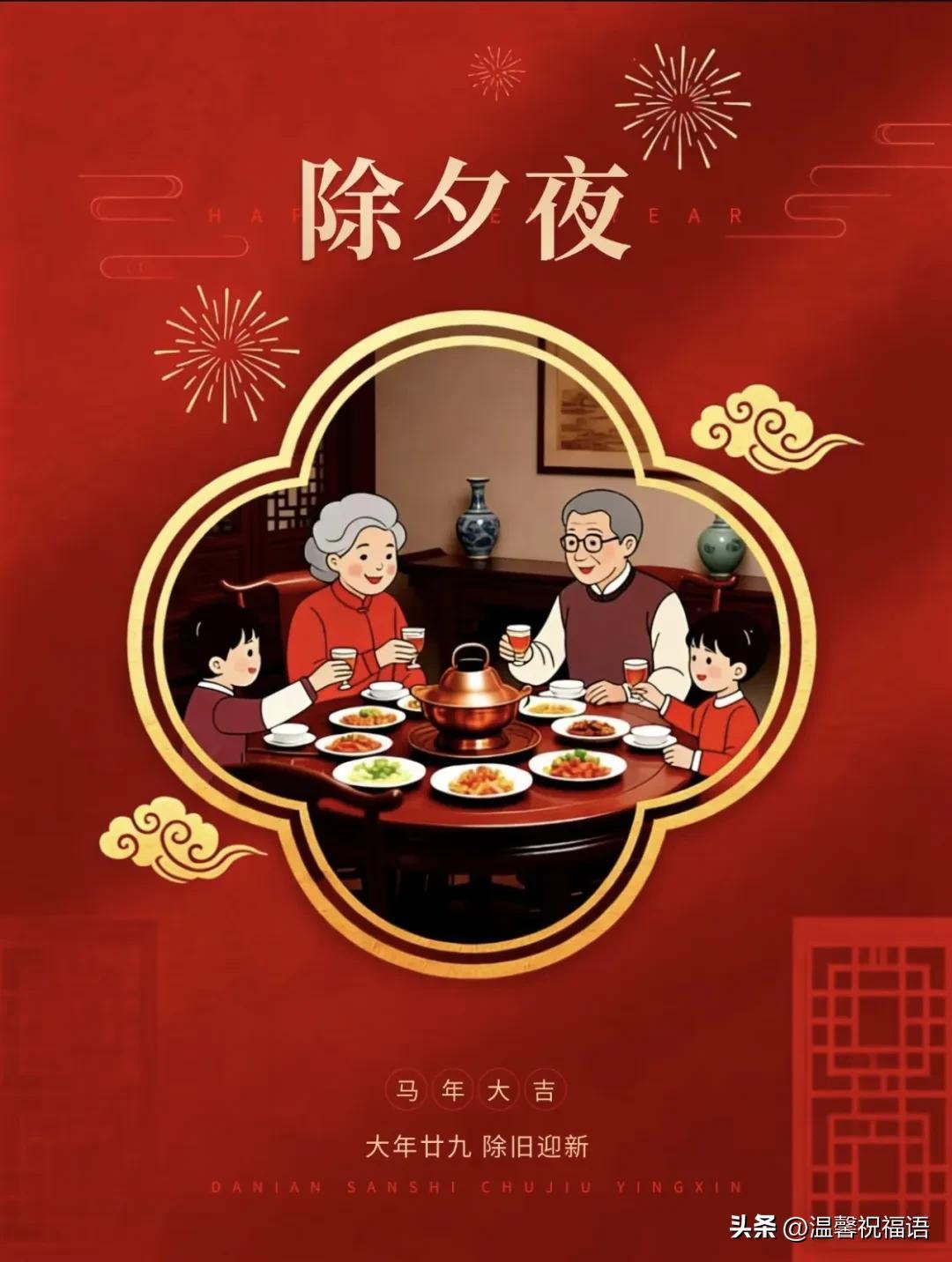 1、除夕良宵,辭舊迎新!金蛇擺尾帶走歲月塵埃,駿馬揚蹄踏來新春錦繡✨。願你把煩惱清零,將快樂置頂,闔家團圓,煙火向星辰,所願皆成真!