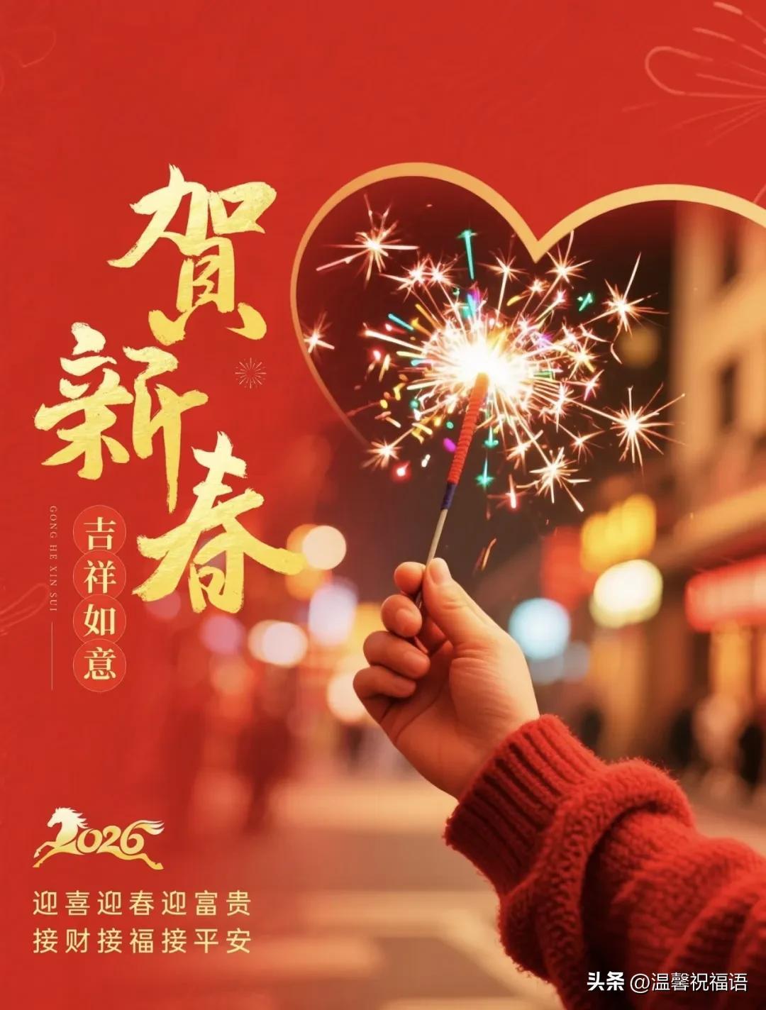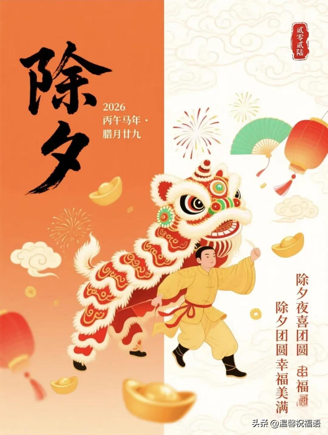 5、辭舊迎新,除夕納福!把舊歲的遺憾打包,將新春的希望點燃。願你在2026年,策馬揚鞭追夢,不負韶華時光,財源廣進,笑口常開,萬事圓滿!