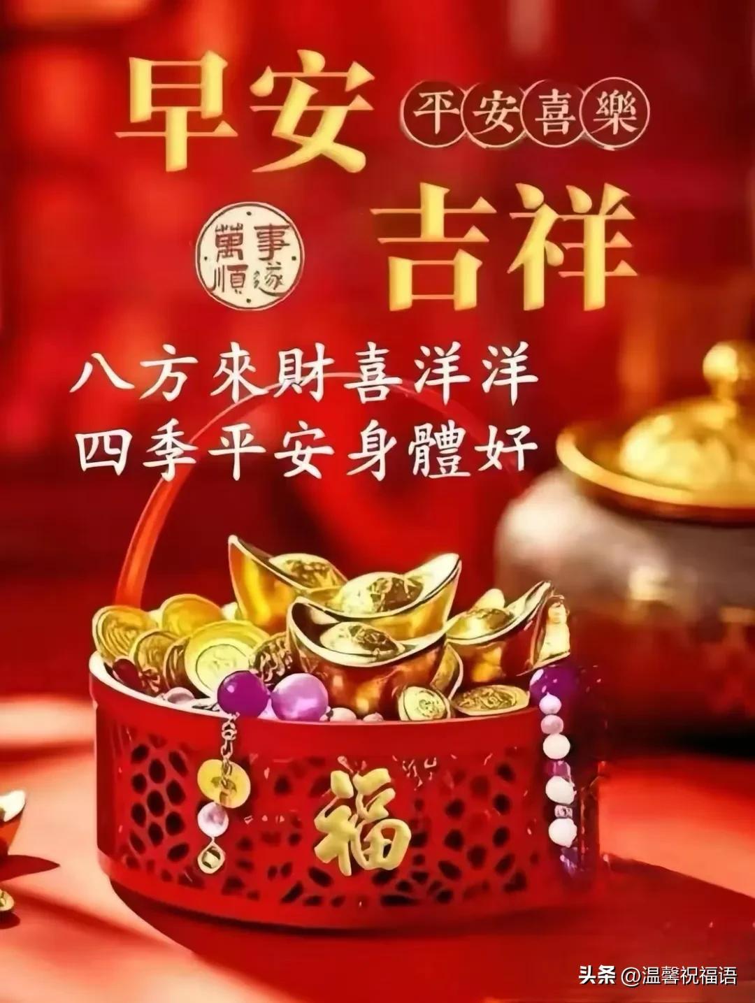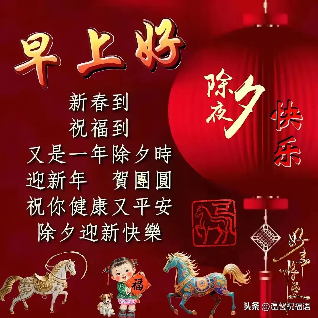 今日除夕早上好,我的祝福不能少。馬年大吉喜洋洋,財源廣進福滿堂。身體健康壽無疆,