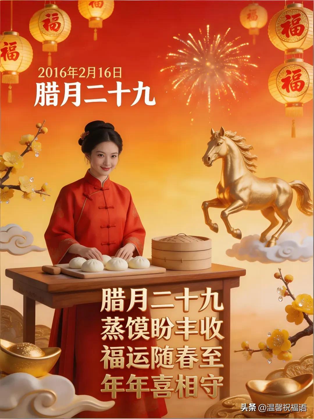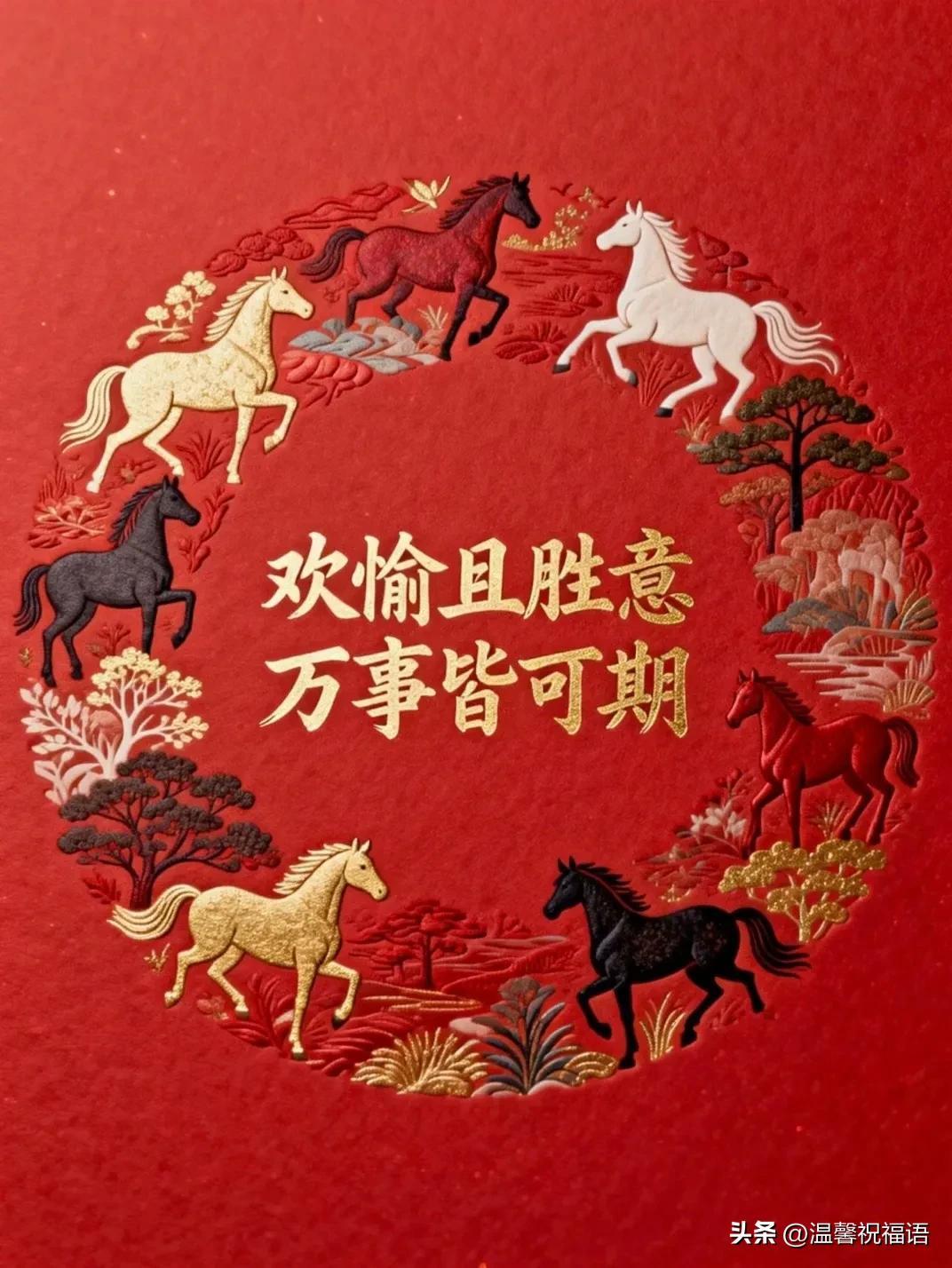 在此辭舊迎新際,送上祝福表心意,身體硬朗如松柏,精神抖擻顯神氣,工作順心無阻力,升職加薪屬第一,家庭和睦少生氣,夫妻恩愛甜蜜蜜,出門遇貴人相助,萬事如意大吉利。除夕快樂!