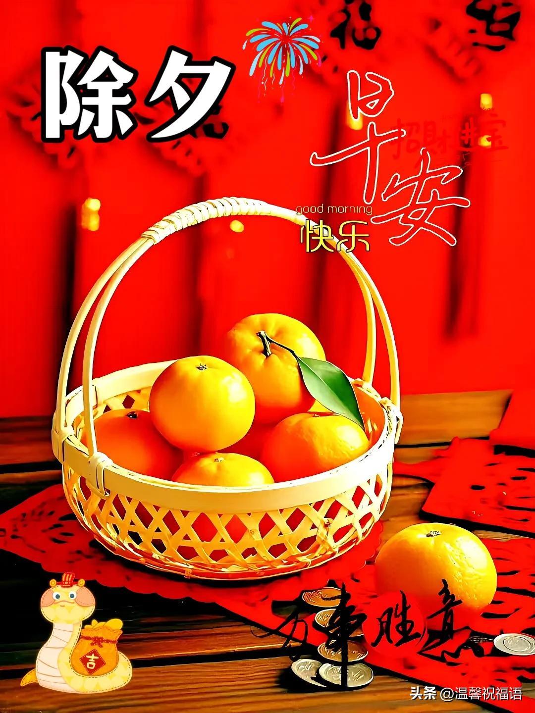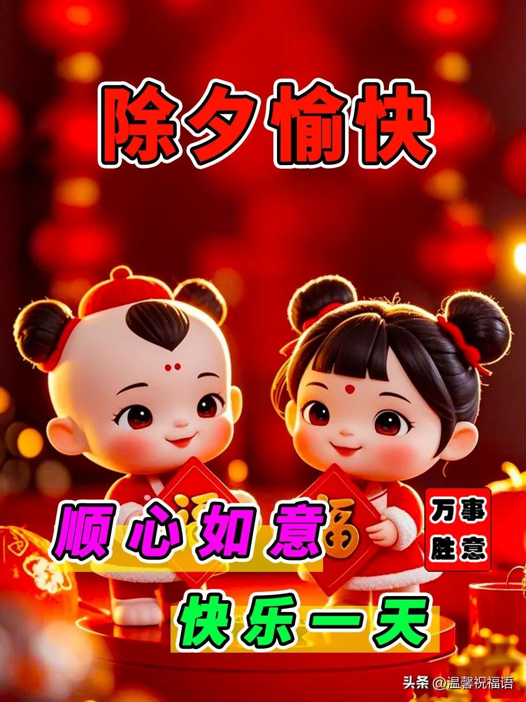 祥雲繚繞除夕臨,鞭炮齊鳴喜慶新。五福臨門福氣至,財運亨通在你身。家庭和睦福滿堂,幸福美滿不煩惱。除夕夜,快樂樂,願你心想事成好!❤️