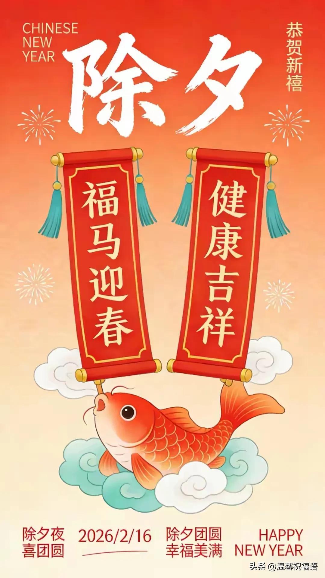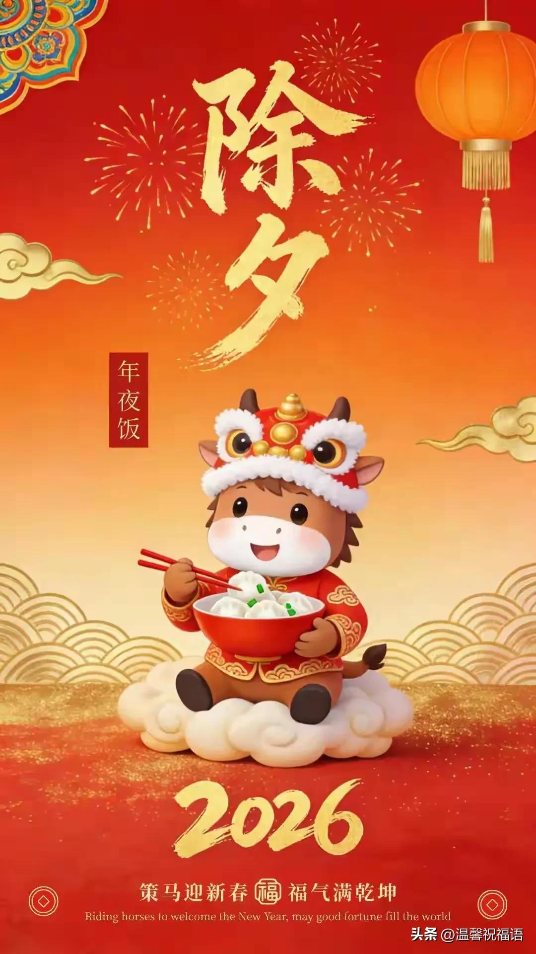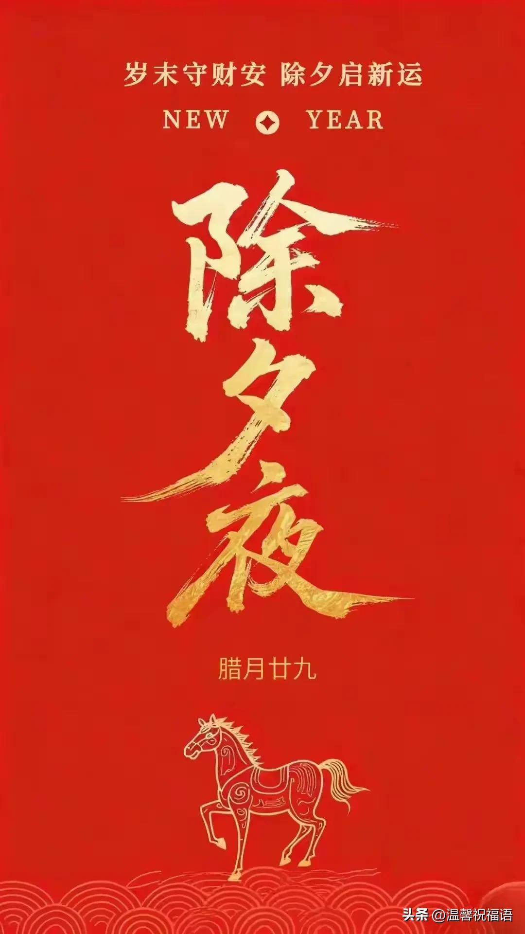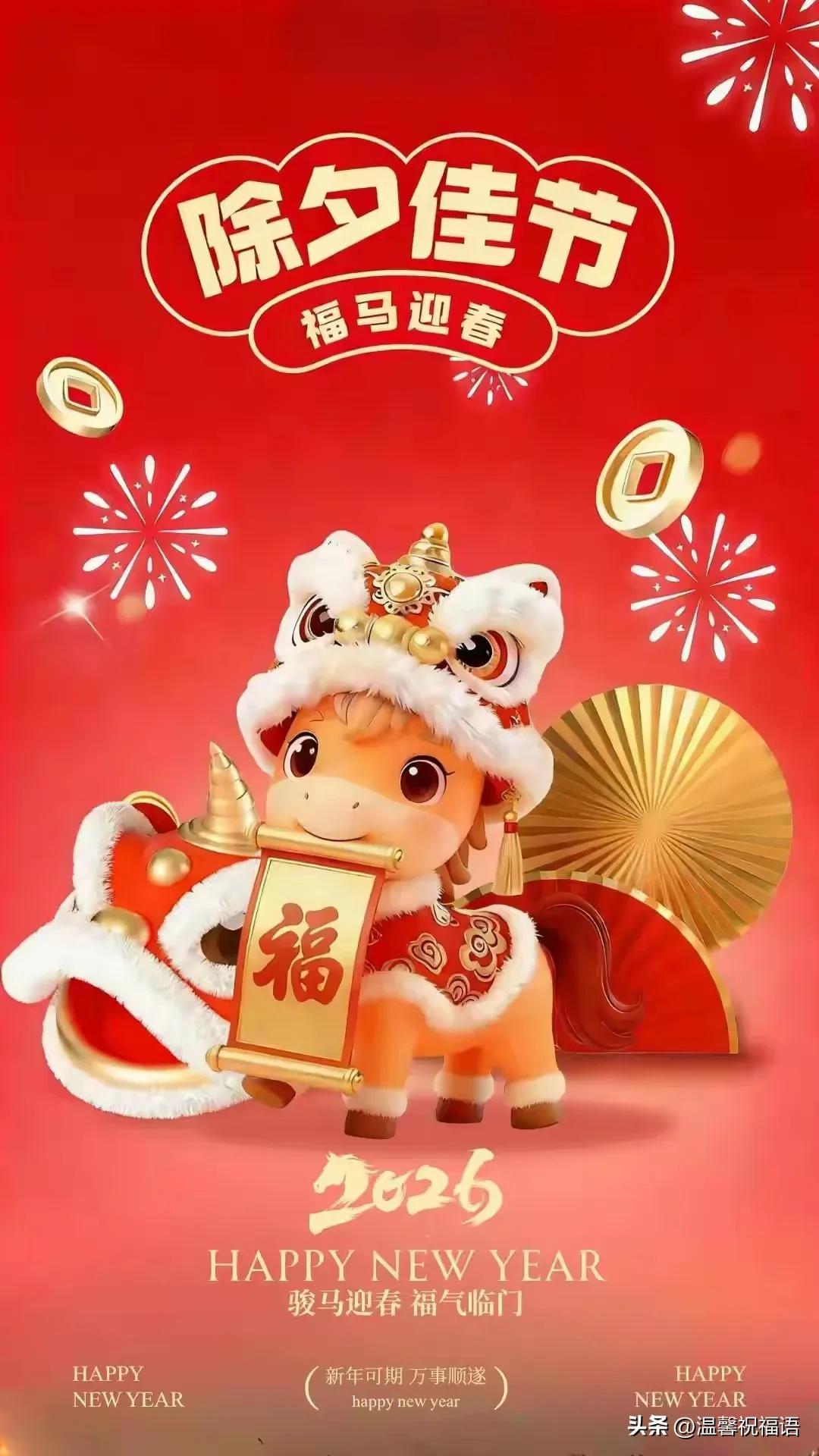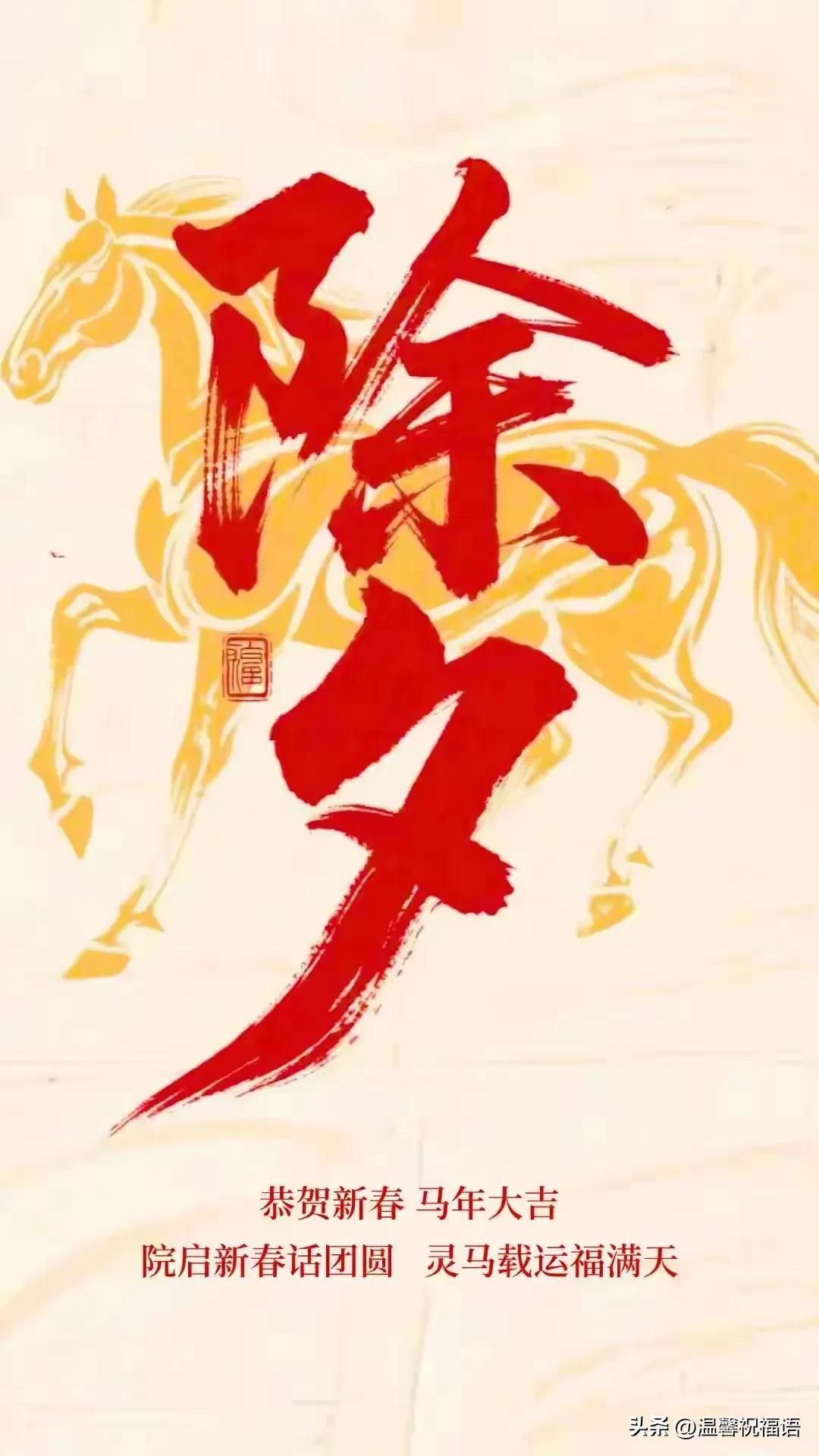 早上好, 除夕到,人歡笑,掛燈籠,紅運高,貼春聯,喜眉梢,鞭炮鳴,煩惱消,煙花綻,吉祥繞,團圓餃,幸福包,情誼濃,祝福送。願快樂好運伴你跑,馬年大吉樂逍遙!