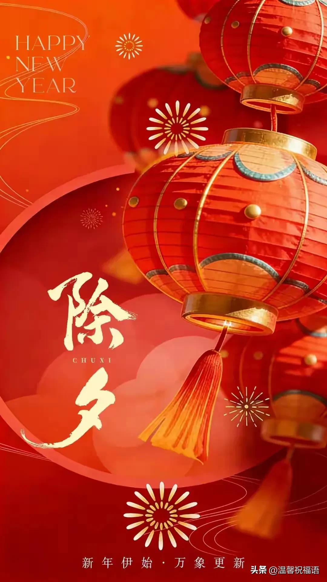 除夕之夜辭舊歲,新年聯歡共舉杯!大紅燈籠高高掛,展望美好新一年!五湖四海同慶賀,全國歡騰笑開顏!祝你除夕之夜喜事多,一年更比一年旺!