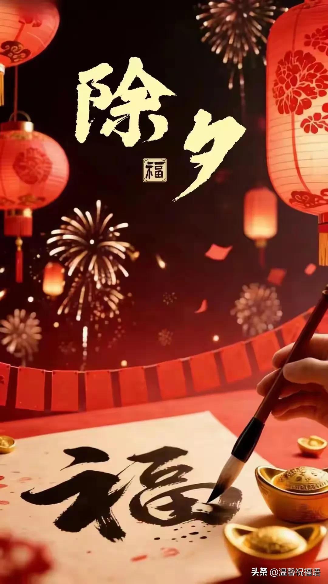 紅紅的對聯門上貼,濃濃的期盼滿心田。長長的鞭炮震天響,驅走陰霾豔陽照。繽紛的煙花夜空綻,快樂吉祥灑人間。祝福的短信急急送,深情厚誼暖融融。祝除夕快樂!