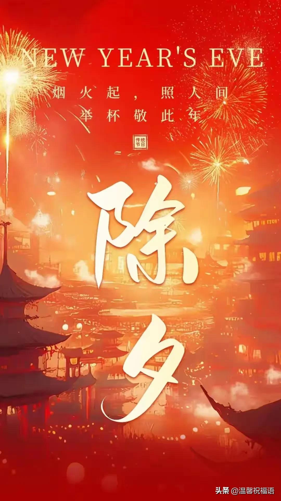 鑼鼓敲響幸福道,鞭炮響起吉祥照。大紅燈籠映錦繡,辭舊迎新拽光耀。長壽麪條彩飛宵,鐘聲響起喜歡笑。瓊漿玉液舉杯幹,閤家團圓守歲曉。祝你除夕快樂!歡聲笑語過節。