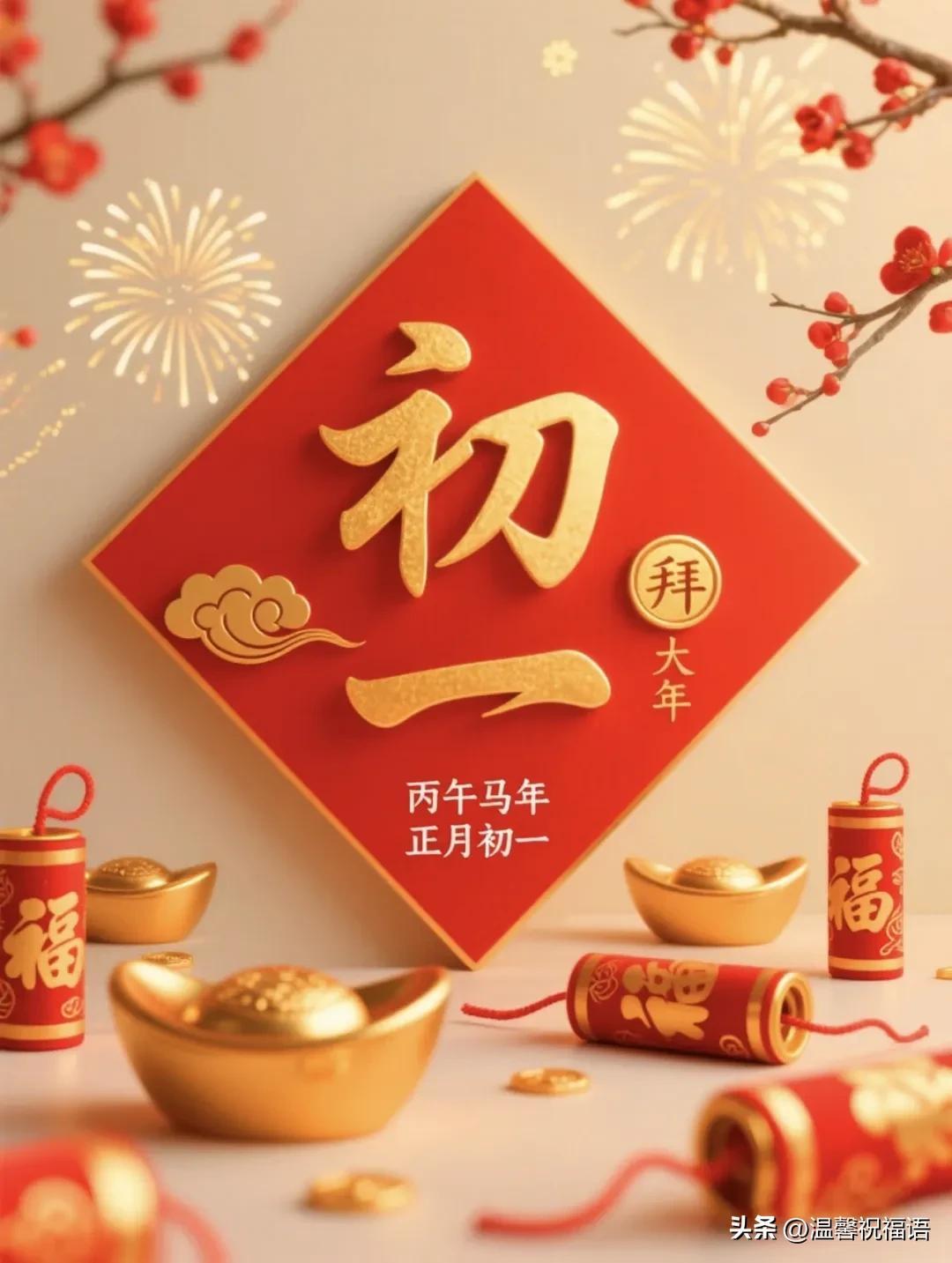 4、初一拜大年,福氣衝雲天!☁️ 金馬賀歲送吉祥,爆竹聲聲辭舊歲。願你身體如駿馬般強健,事業如千里馬般飛馳,家庭和美,萬事勝意!