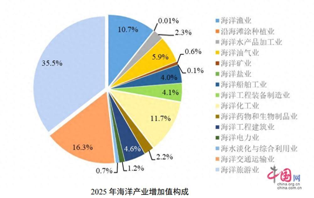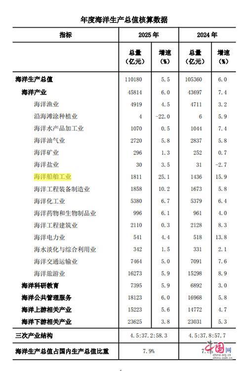 中國網3月13日訊(記者趙娜)中國自然資源部13日在北京發佈《2025年中國海洋經濟統計公報》顯示,初步覈算,2025年全國海洋生產總值110180億元,比上年增長5.5%,佔國內生產總值比重爲7.9%,比上年高0.1個百分點。從三次產業結構來看,海洋第一產業增加值4923億元,第二產業增加值41017億元,第三產業增加值64240億元,分別佔海洋生產總值的4.5%、37.2%和58.3%。
