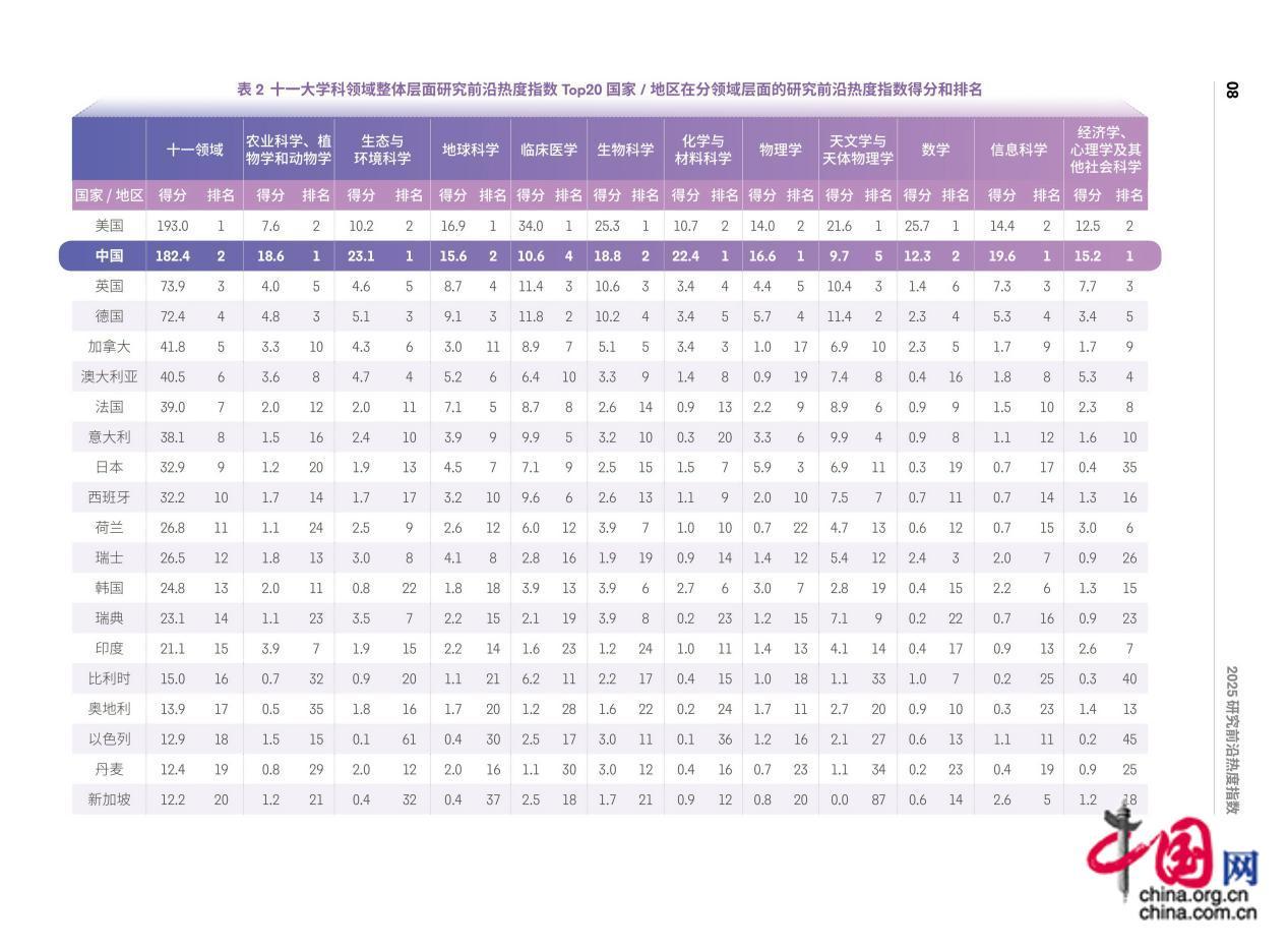 報告顯示,美國在地球科學、臨牀醫學、生物科學、天文學與天體物理學、數學領域得分排名第一,基礎研究活躍程度整體最強;中國在農業科學(植物學和動物學)、生態與環境科學、化學與材料科學、物理學、信息科學及經濟學心理學及其他社會科學領域展現出領先優勢。