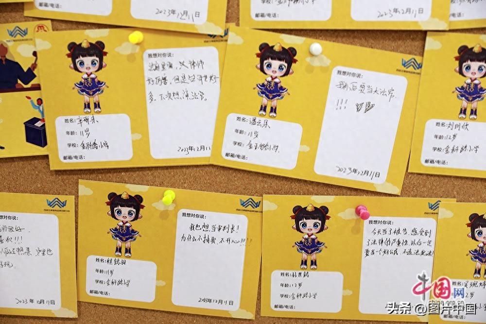 “今天當了被告,感受到了法律的嚴重性,以後一定要當個好公民不違法犯法!”“我以後要當大法官!!!”……在青少年普法教育基地四樓的模擬法庭門前,一面充滿着童言稚語的留言板讓人感受到了沉浸式普法教育的力量。