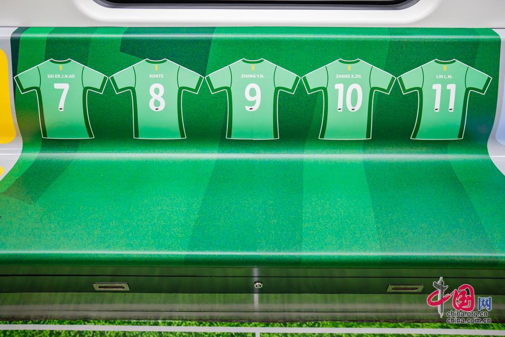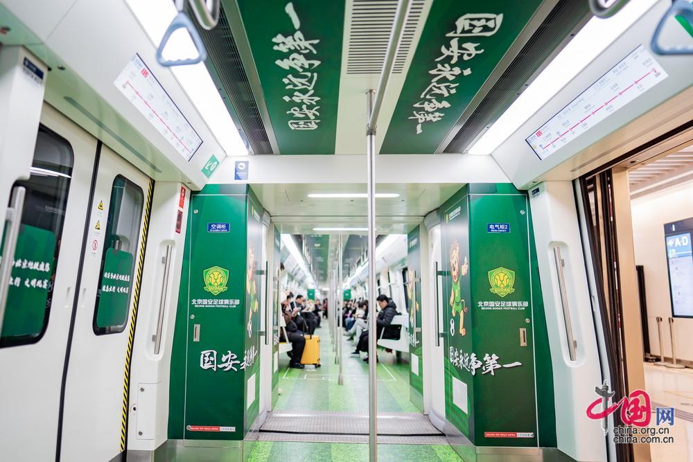 北京地鐵3號線主題列車與主題車站同步推出,車廂內從ABC位、地貼、頂貼到座椅貼全面煥新,座椅區域特別印製國安球員的球衣號碼與專屬圖案。中國網記者 鄭亮攝