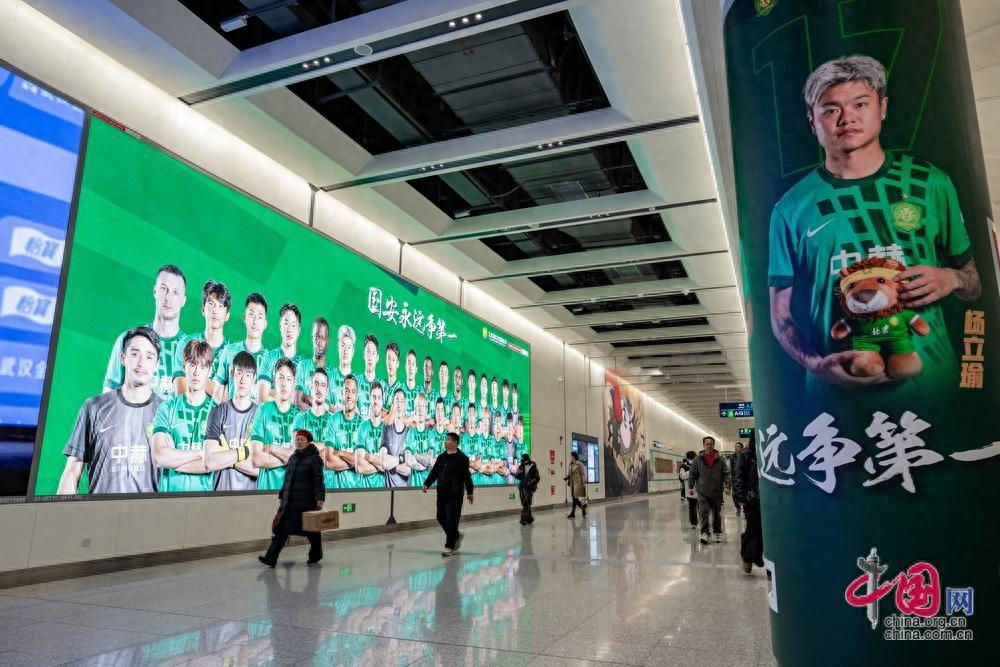 此次主題車站打造,以“固定站點+流動車廂”雙場景聯動,打造全景式沉浸氛圍,不僅刷新了市民的日常出行體驗,更讓往返球場的球迷提前進入“觀賽狀態”,實現“未進球場,先入主場”。站內十餘項優質媒體資源齊上陣——站廳LED電子屏、燈箱、梯頂LED、吊掛式LED、站臺立式大屏等循環播放國安新賽季賽事集錦與高光瞬間;11根站廳包柱量身定製國安球員海報,整個車站空間被足球主題元素全面覆蓋,沉浸感無處不在,讓每位乘客都能感受到綠茵激情。通過將足球熱情融入軌道交通,引導更多球迷和市民選擇地鐵前往賽場,有效緩解周邊交通壓力,助力城市低碳環保。