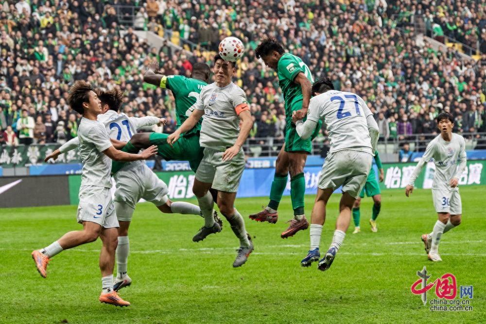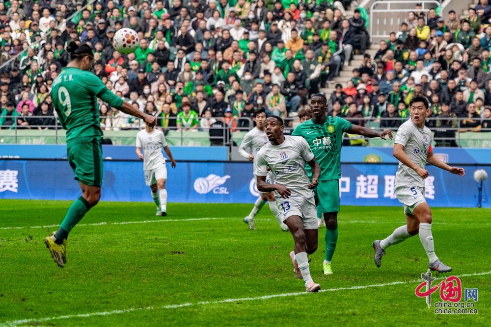 3月21日,在北京工人體育場進行的2026賽季中國足球協會超級聯賽第三輪的比賽中,北京國安隊主場1比1戰平上海申花隊。圖爲上海申花球員頭球攻門。中國網記者 鄭亮攝