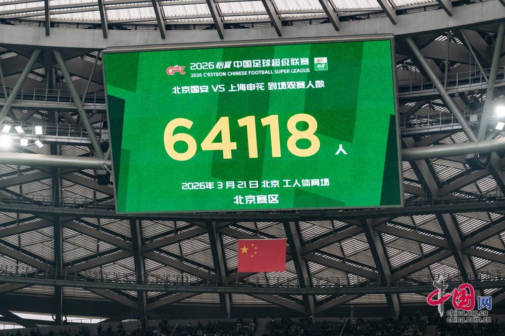 3月21日,在北京工人體育場進行的2026賽季中國足球協會超級聯賽第三輪的比賽中,北京國安隊主場1比1戰平上海申花隊。本場工體迎來64118名現場觀衆,打破了上賽季“京滬大戰”創下的62291人的新工體上座率紀錄。中國網記者 鄭亮攝