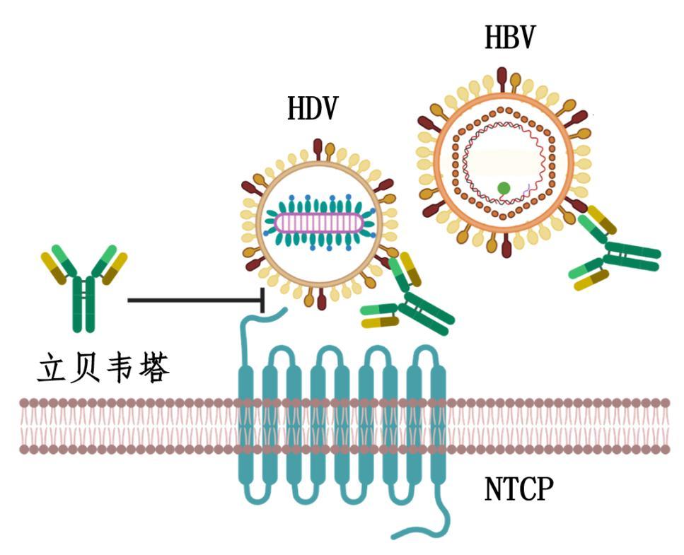 立貝韋塔藥物作用機理示意圖(HDV: 丁型肝炎病毒;HBV:乙型肝炎病毒)