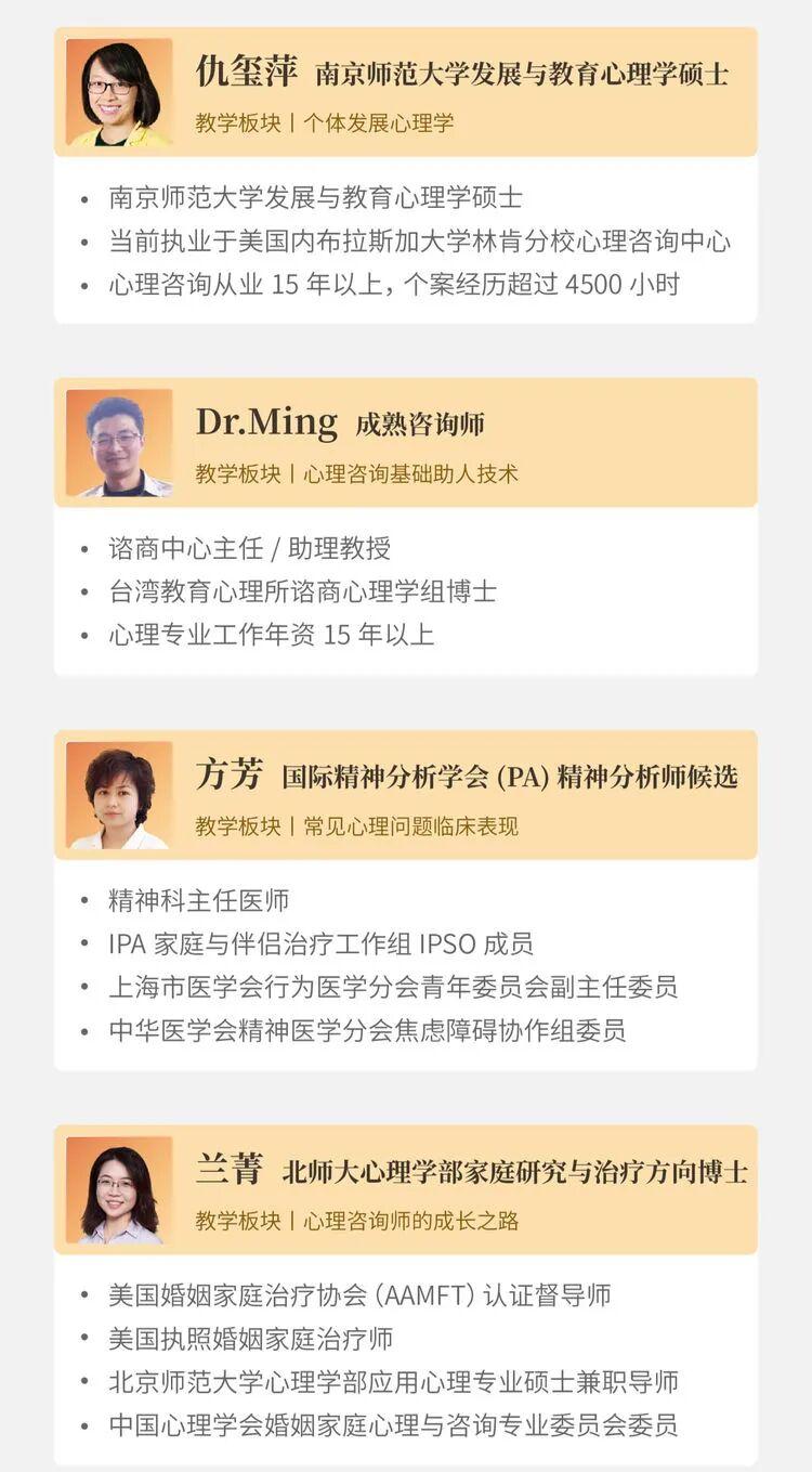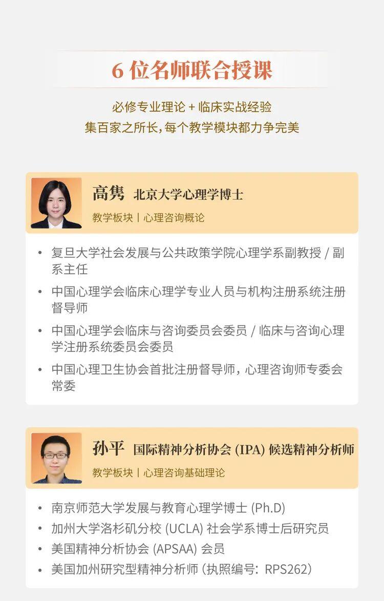 6位來自海內外知名院校、接受過國際認證的專業培訓項目、且在心理諮詢臨牀工作的平均年限不低於10年的專業老師,帶領大家輕鬆完成能力提升。