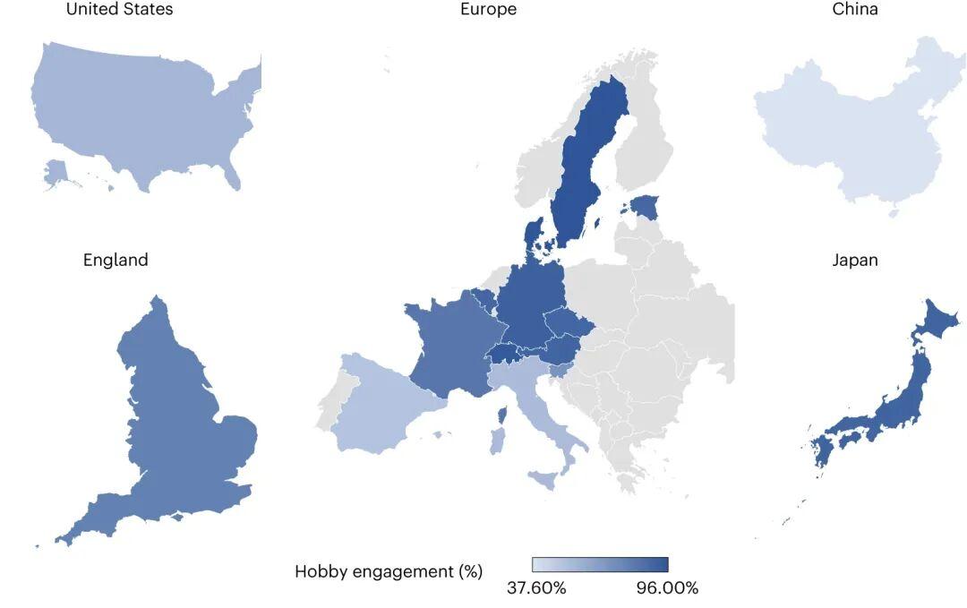 一項研究調查了16個國家,發現各國人們興趣愛好參與度差異顯著,中國最低,只有37.6%的人擁有興趣愛好;丹麥最高,受訪者中96.0%的人擁有興趣愛好[7]。
