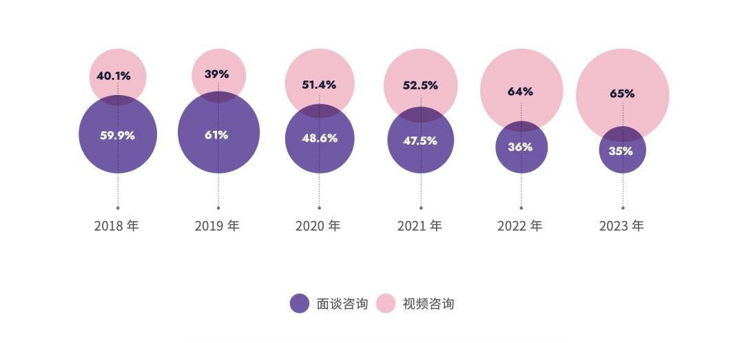 視頻諮詢在近幾年迅速發展,自 2020 年開始已經穩定地超過面談諮詢,佔比超過 60%,成爲用戶選擇的主要諮詢方式。