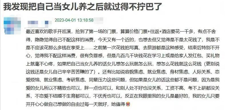 豆瓣網友發帖分享的「把自己當女兒養」的經歷很好地詮釋了這一點:「因爲是我愛的女兒所以不精緻也可以,胖一點也可以,和別人處不好也沒關係,工資不高、考不上研都沒關係,不戀愛不結婚不生育都可以,不優秀也可以」。