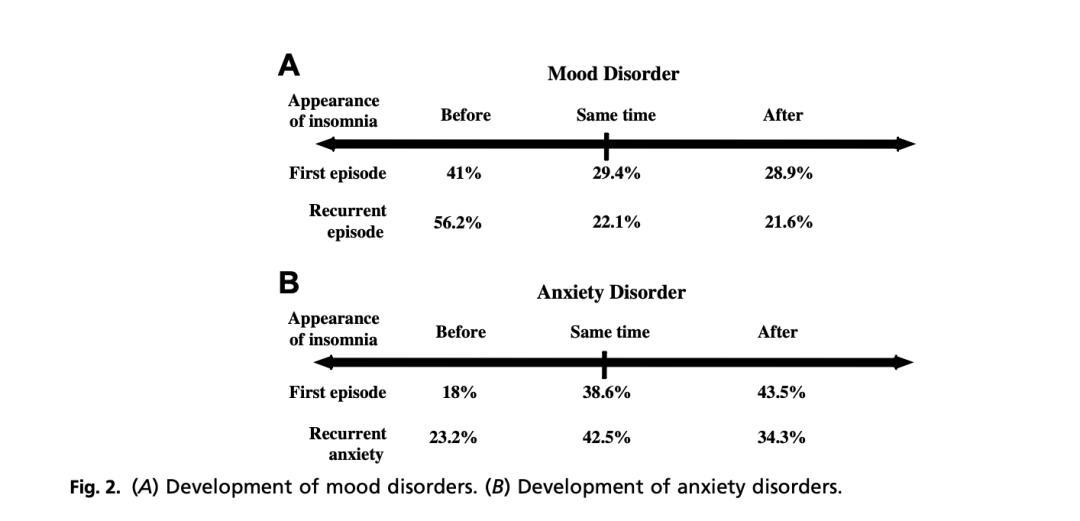 另一項探究失眠與情緒、焦慮障礙時間序列的研究報告稱:70%的情緒障礙患者此前存在失眠,且在近半數病例中,失眠先於情緒障礙出現;三分之一的焦慮障礙患者存在失眠,約五分之一的病例中,失眠症狀先於焦慮障礙出現[15]。