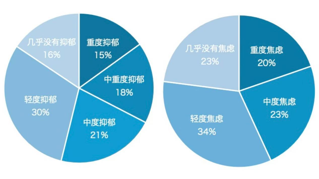 我國精神障礙人士照顧者抑鬱水平(左)和焦慮水平(右)(圖源:“心聲Mind”公衆號)