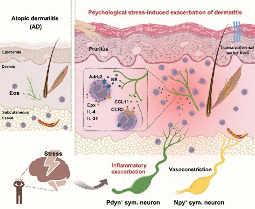 “研究系統闡明瞭一條由大腦心理壓力應激信號驅動的‘交感神經—嗜酸性粒細胞’神經免疫軸。”柳申濱介紹,團隊逐一解析了關鍵分子:交感神經通過趨化因子CCL11與嗜酸性粒細胞表面受體CCR3相匹配,招募其聚集到皮膚真皮層,開啓β2腎上腺素能受體激活“開關”後發揮促炎症作用。