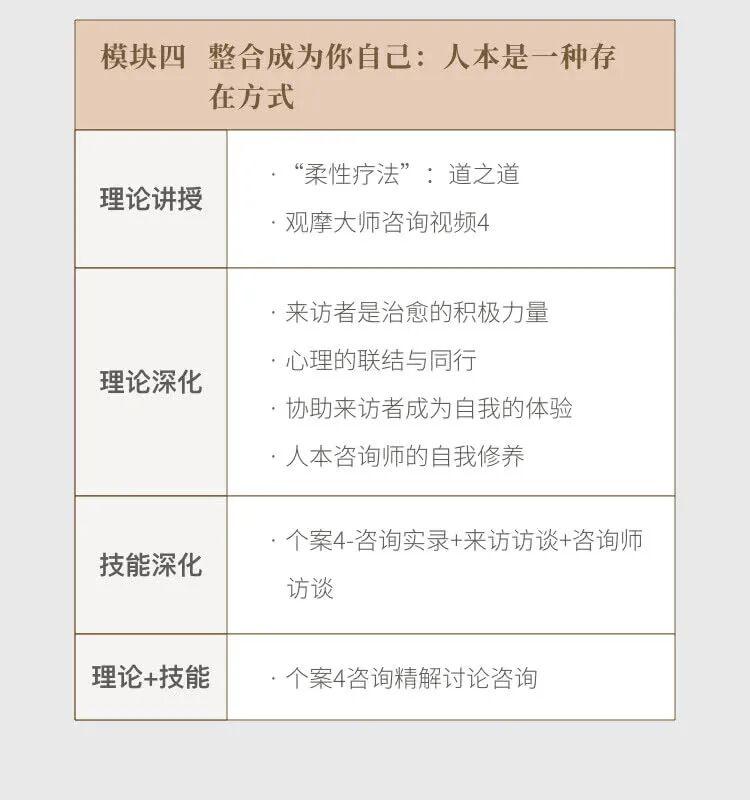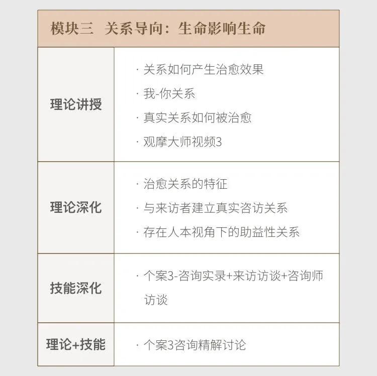 ▨ 技能培養:諮詢實錄+來訪訪談+諮詢師訪談,搭配有「教員諮詢場景實錄」分析教學視頻,深入感知技術應用;