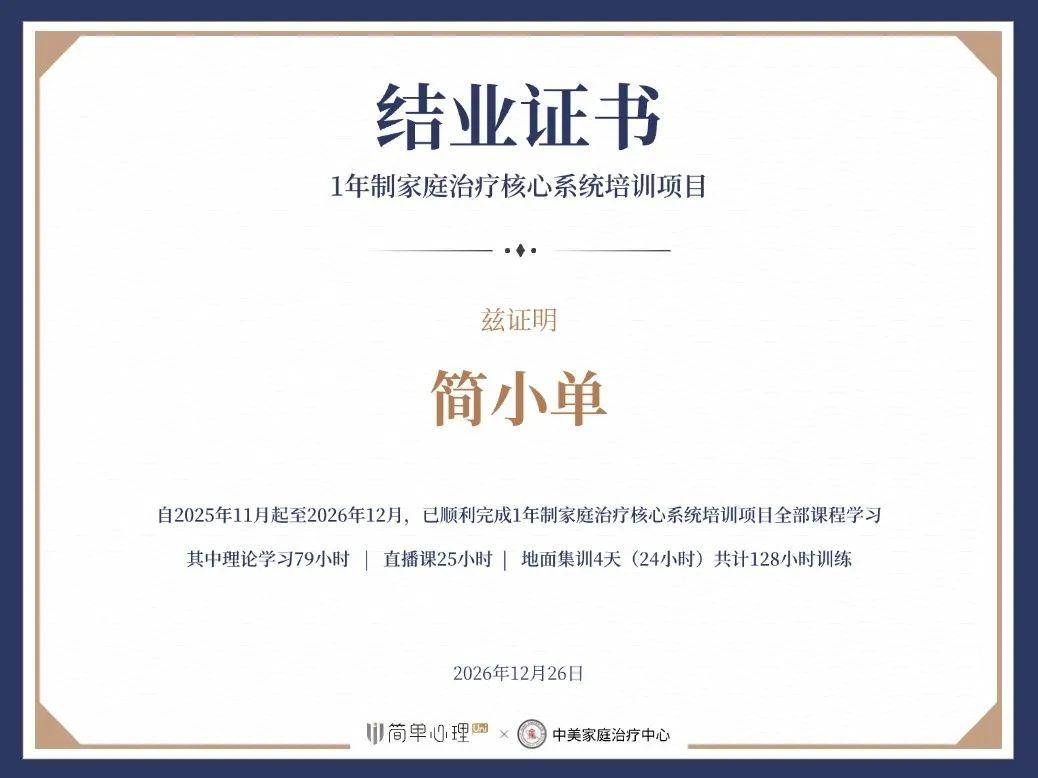 一年項目培訓之後,如果你達到項目結業要求併成功結業,可獲得簡單心理Uni與中美家庭治療中心共同認證的學習證書。