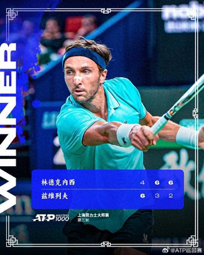 10月6日訊 上海大師賽男單第三輪,3號種子茲維列夫1-2遭逆轉。法國選手林德克內西以4-6 6-3 6-2逆轉3號種子茲維列夫,繼溫網首輪後再勝對手,首次躋身賽會16強,接下來他將對陣15號種子萊赫卡。