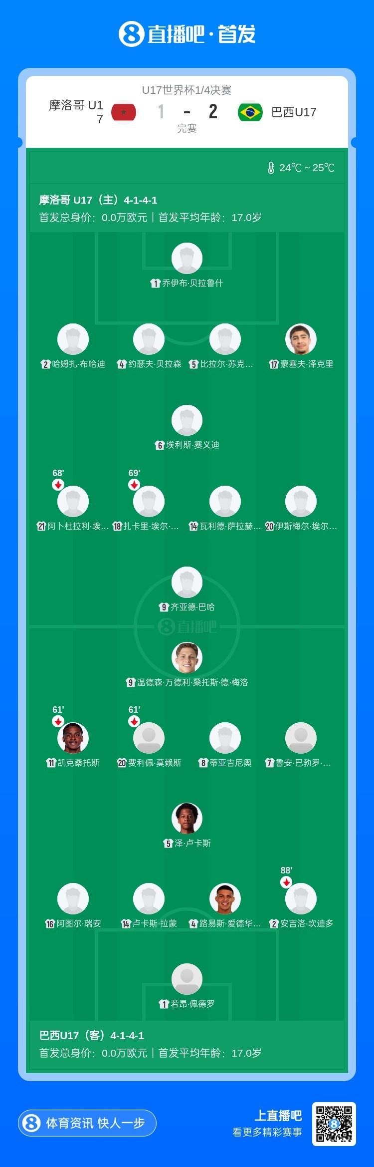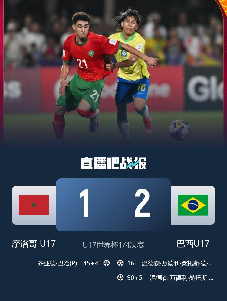 11月22日訊 北京時間23:45,U17世界盃1/4決賽摩洛哥U17vs巴西U17。上半場,巴西隊率先取得領先,但半場補時階段摩洛哥獲得點球,巴哈點射扳平!下半場,補時階段溫德森·梅洛讀秒絕殺!最終,巴西2-1擊敗摩洛哥,晉級U17世界盃4強!