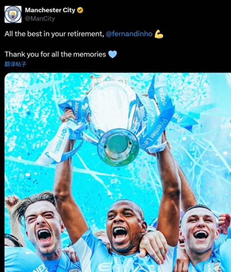 曼城官方曬出了費爾南迪尼奧手捧英超冠軍獎盃的照片,並配文:“祝福你在退役後一切順利!@費爾南迪尼奧。感謝你曾帶給我們的所有回憶。”