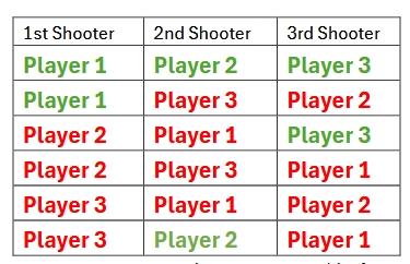 2、任何未按順序在指定投籃地點進行的投籃均不計入成績,下表列出了位置1-6的投籃順序,綠色表示該隊員的投籃將被計入成績,紅色則表示該投籃將不計入成績;
