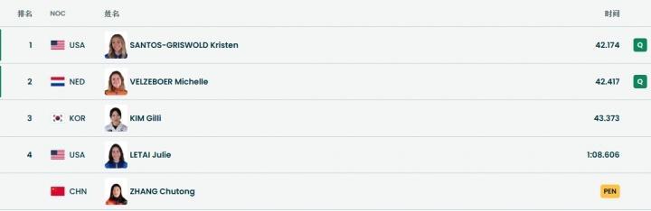 張楚桐也被判犯規無緣晉級,範可新以42.737秒晉級半決賽。