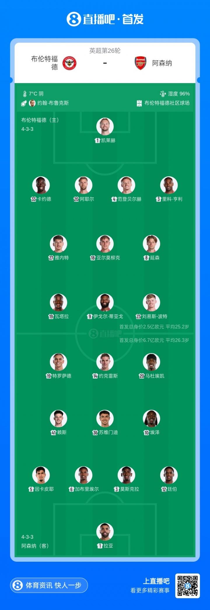 2月13日訊 北京時間2月13日4:00,英超第26輪,布倫特福德vs阿森納。賽前雙方公佈了本場比賽的首發名單。【阿森納方面,哈弗茨、梅里諾等球員因傷無緣大名單,薩利巴也因病缺席了本場比賽。埃澤、莫斯克拉此役爲槍手先發。】