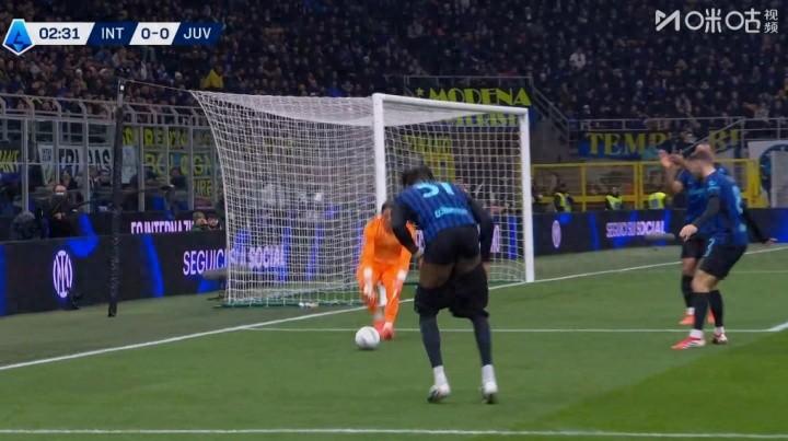 02月15日訊 國米vs尤文開場3分鐘,比塞克防下伊爾迪茲,這下倒地時比塞克褲子掉了!
