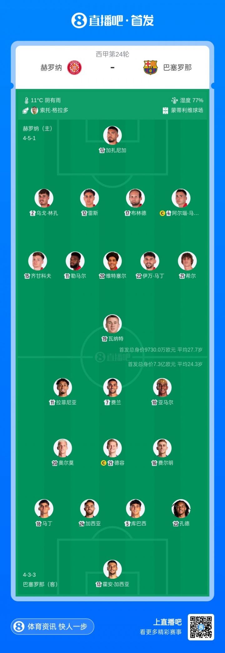 巴薩首發:13-霍安·加西亞、5-庫巴西、18-赫拉德·馬丁、23-孔德、24-埃裏克·加西亞、16-費爾明、21-德容、20-奧爾莫、7-費蘭、10-亞馬爾、11-拉菲尼亞