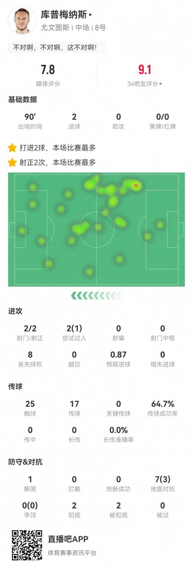 2月18日訊 尤文在本輪歐冠附加賽首回合2-5慘敗加拉塔薩雷,庫普梅納斯本場數據如下: