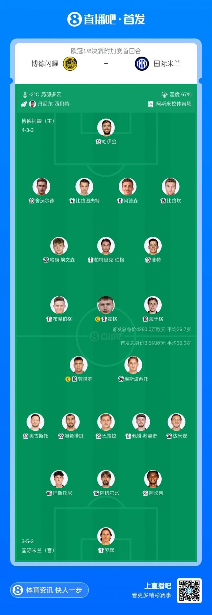 2月19日訊 北京時間2月19日凌晨04:00歐冠1/8決賽附加賽首回合,國米做客挑戰博德閃耀,目前雙方公佈了本場比賽的首發陣容。