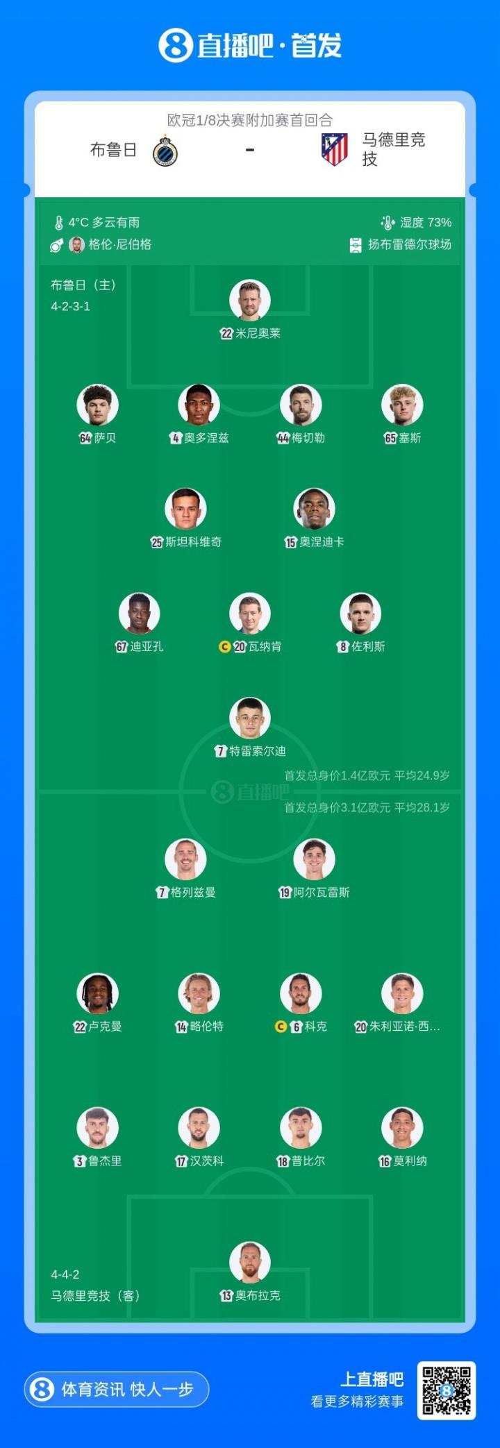 2月19日訊 北京時間2月19日凌晨04:00歐冠1/8決賽附加賽首回合,布魯日坐鎮主場迎戰馬德里競技,目前雙方公佈了本場比賽的首發陣容。