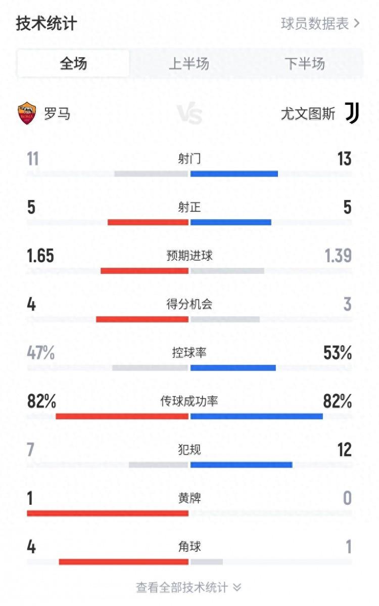 3月2日訊 羅馬在本輪意甲3-3戰平尤文,以下是兩隊全場數據。射門11比13射正5比5預期進球1.65比1.39得分機會4比3控球率47%比53%傳球成功率82%比82%犯規7比12黃牌1比0角球4比1