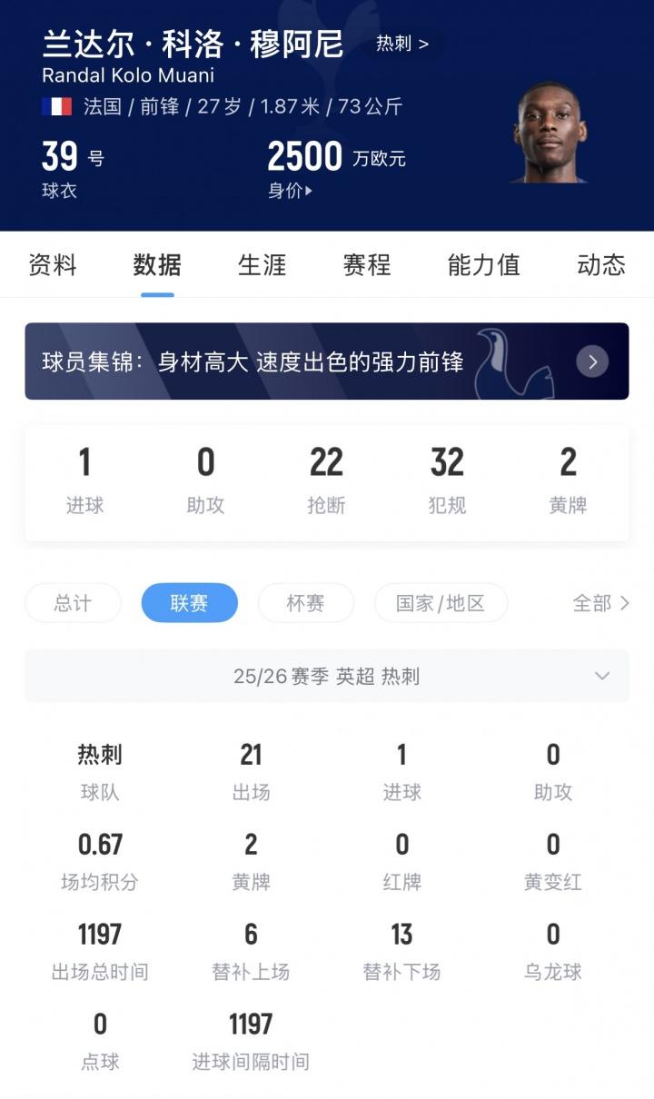 本賽季,穆阿尼爲熱刺出場30次,貢獻4球3助,其中英超21場僅1球。穆阿尼在2023年效力法蘭克福時巔峯身價8000萬歐,此後他的身價遭遇6次下跌,如今僅剩2500萬歐。