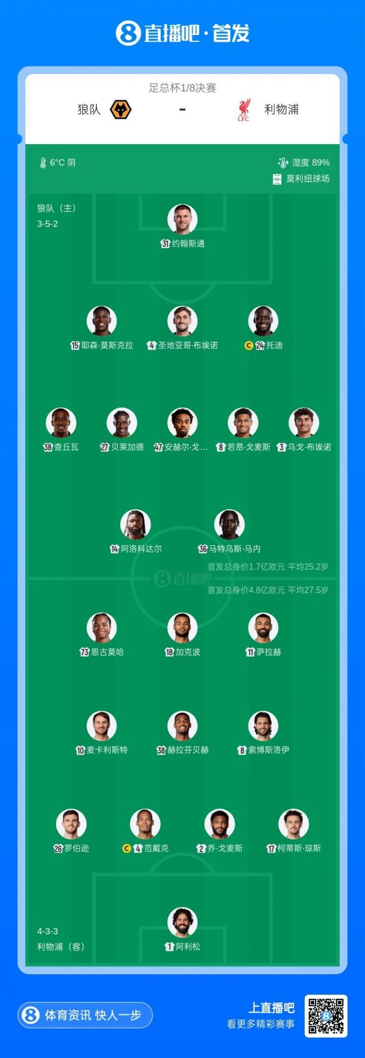 03月07日訊 足總盃16強對陣,狼隊主場迎戰利物浦比賽即將打響。賽前首發出爐。