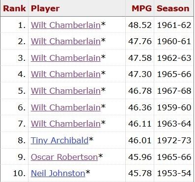 據ESPN統計,張伯倫還保持着一些不太可能被打破的紀錄,如單場55籃板、單賽季2149籃板、生涯總籃板23924、單賽季場均上場時間48.5分鐘、生涯場均上場45.8分鐘。
