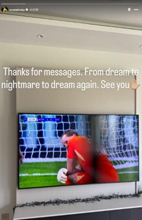 今日金斯基在風波後首次更新社媒,他的配圖正是電視上自己失誤懊悔的瞬間。此外他寫道:“謝謝大家的信息。從夢想,到噩夢,再到夢想。大家再會。✋”